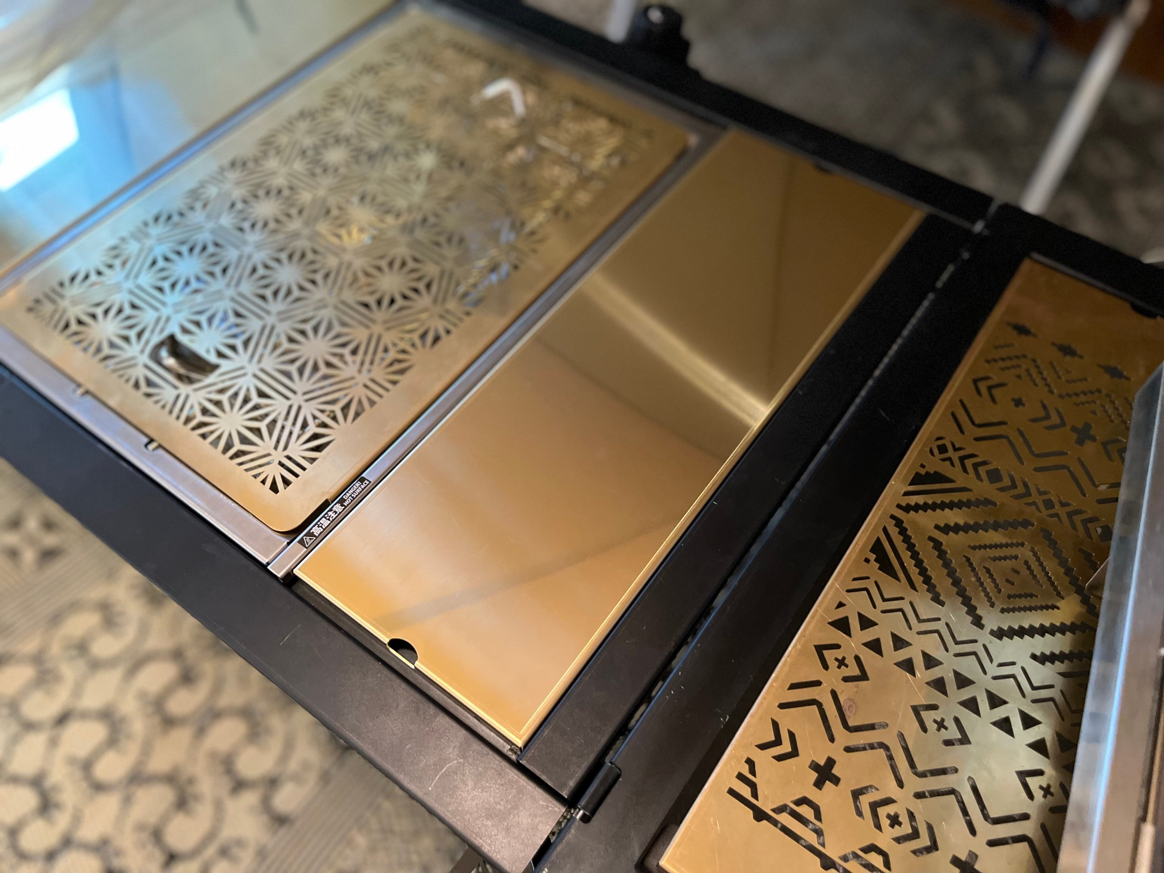 "アイアングリルテーブル(IGT)にセットし、スペースを埋めることができる真鍮製ハーフユニットのプレートです。数種類あるデザインから、自分の好きな柄を組み合わせて自分スタイルで楽しめます。