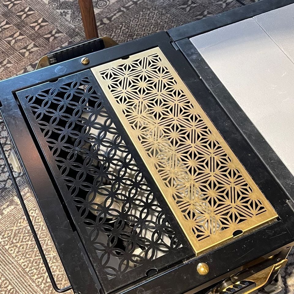 "アイアングリルテーブル(IGT)にセットし、スペースを埋めることができる真鍮製ハーフユニットのプレートです。数種類あるデザインから、自分の好きな柄を組み合わせて自分スタイルで楽しめます。