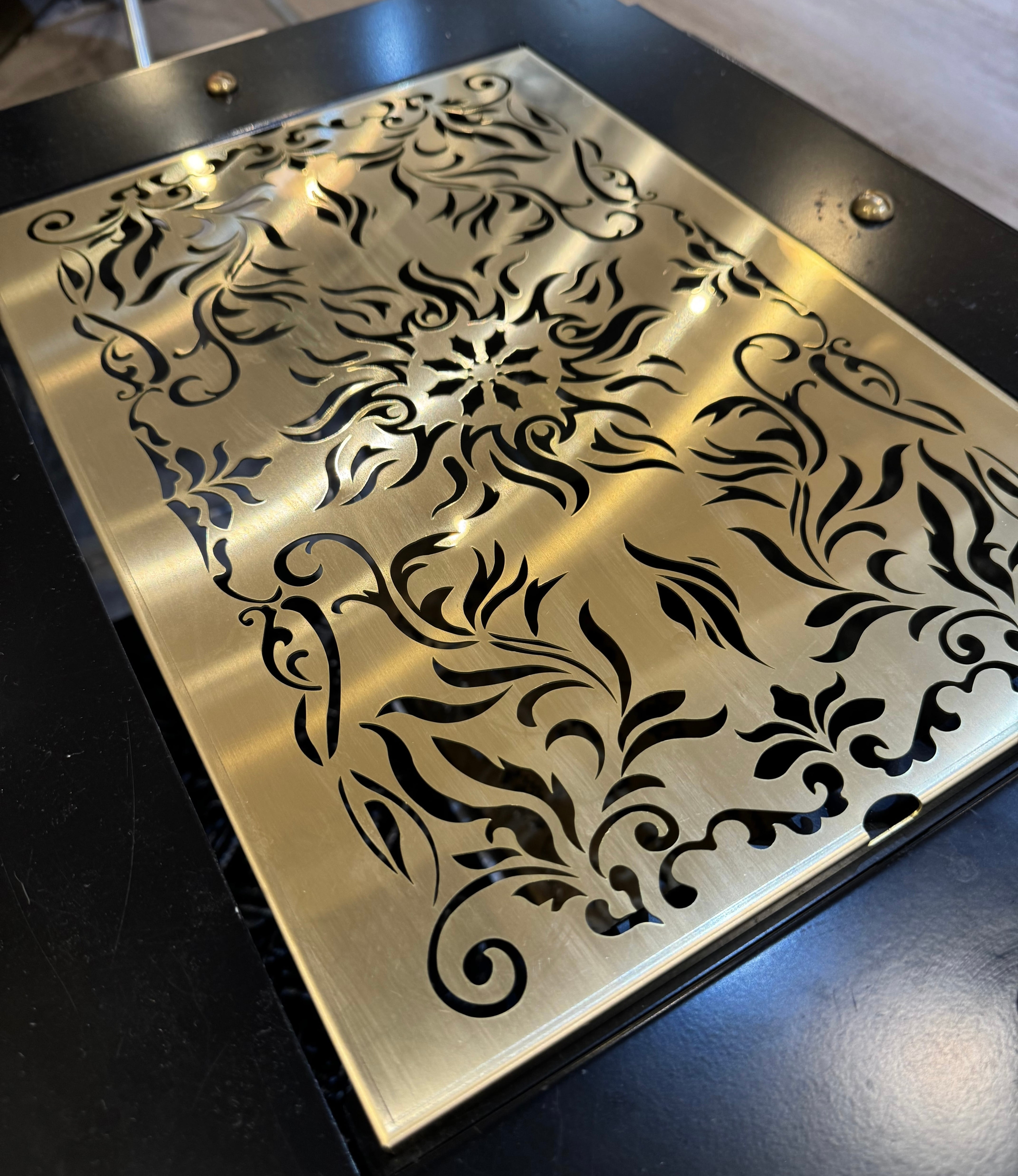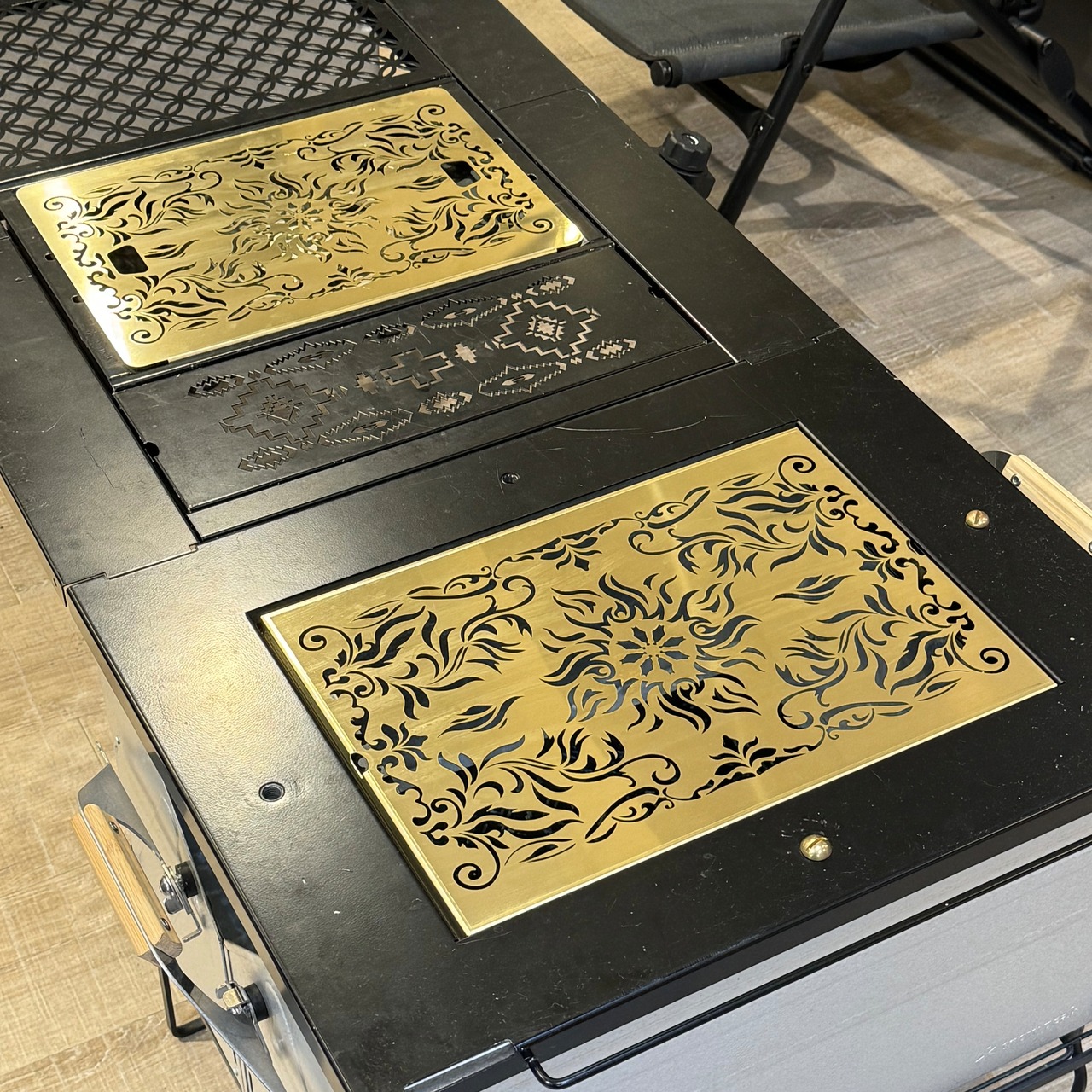 "アイアングリルテーブル(IGT)にセットし、スペースを埋めることができる真鍮製ワンユニットのプレートです。数種類あるデザインから、自分の好きな柄を組み合わせて自分スタイルで楽しめます。